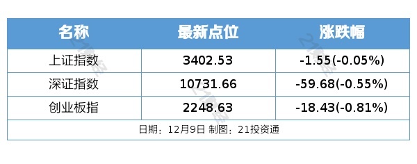 12月9日,A股三大指数集体收跌,截至收盘,沪指跌0.05%,深成指跌0.55%,创业板指跌0.81%,北证50指数跌4.31%,全市场成交额16612亿元,较上日缩量1564亿元。
